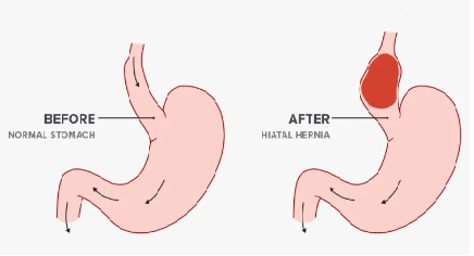 This is a condition where a portion of the stomach migrates up into the chest through the diaphragm (a muscle separating the chest & abdomen). It is usually associated with gastro-esophageal reflux disease.
