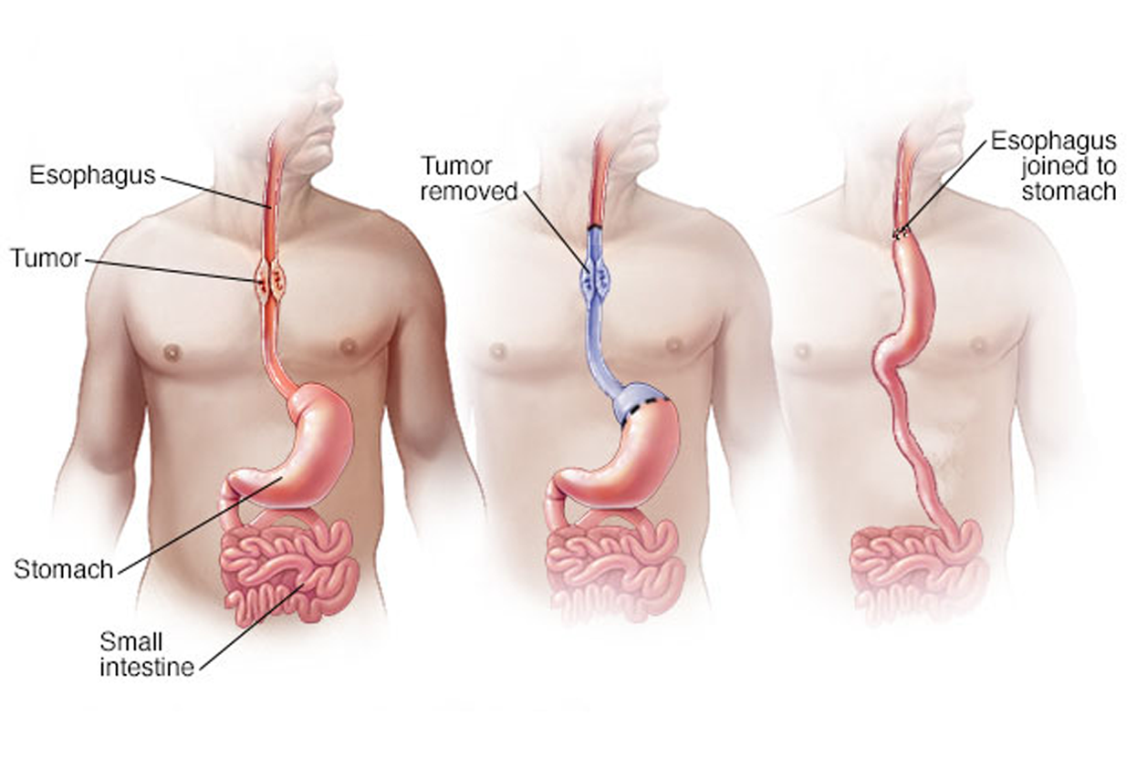 When the cancer is in the mid or upper portion of the esophagus, the food pipe needs to be removed completely and continuity established by pulling the stomach or colon up into the chest or neck. This procedure can be done by open technique or by keyhole surgery (thoraco-laparoscopy).